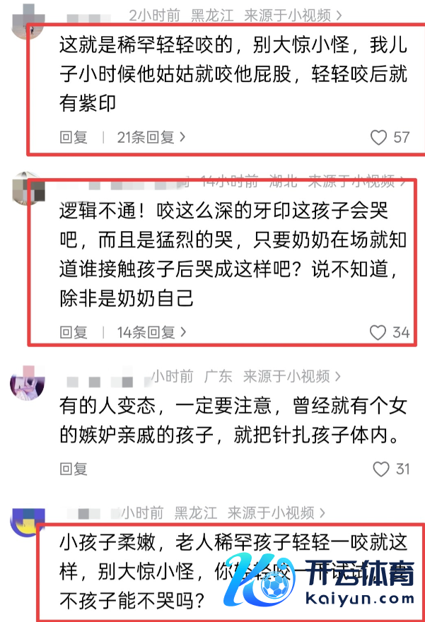 不外也有不同声息出现,有网友认为李女士响应过度:“可能是哪个小孩以为宝宝可儿,轻轻咬了一下,小孩子皮肤娇嫩才会淤青,没必要这样较真。”这种说法坐窝遭到其他家长反驳:“三个月的宝宝皮肤和骨骼皆没发育好,再轻的咬也可能形成伤害,况兼咬东说念主的行动自己就不应该被容忍。”更有网友直指问题中枢:“不管是谁咬的,奶奶手脚那时的监护东说念主,没看好孩子便是溺职。”
