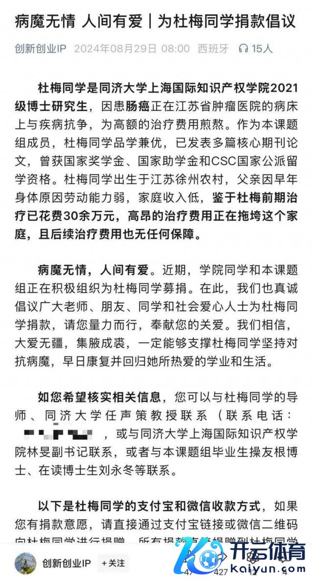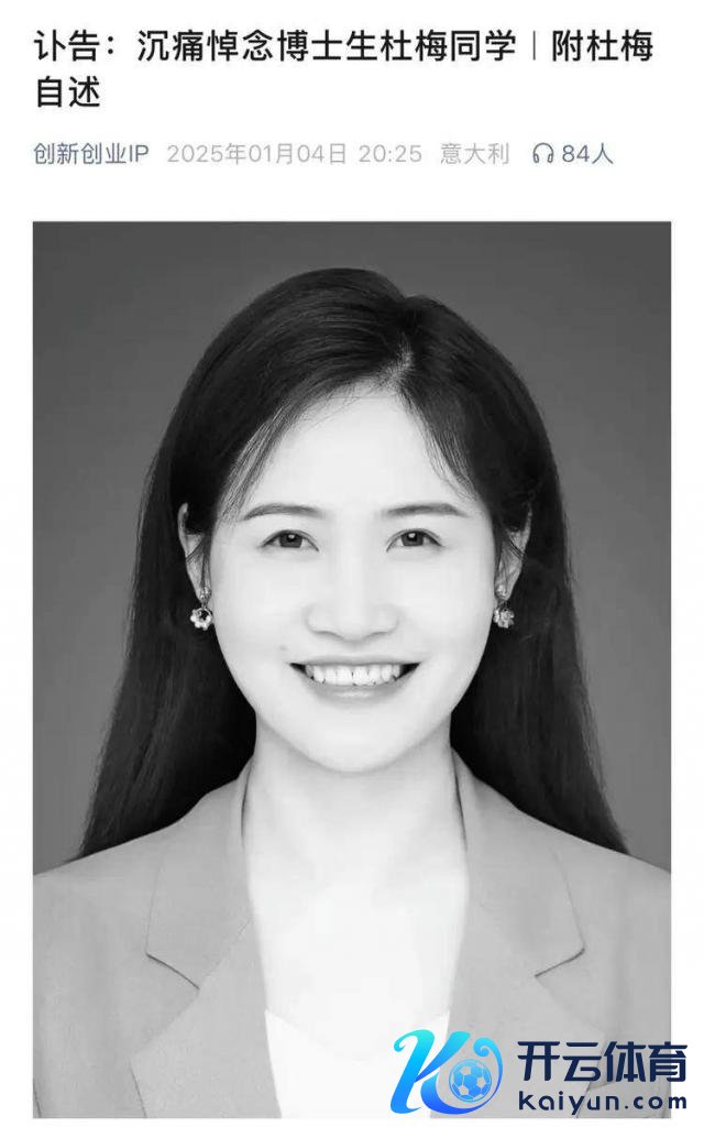 1 月 4 日,同济大学革命创业 IP 课题组发布一则讣告,讣告骄矜同济大学优秀博士生杜梅于 1 月 3 日 21 时 58 分因病不幸殒命,享年 30 岁。杜梅本科就读于江苏科技大学东说念主文社科学院,硕士就读于上海大学,2021 年考入同济大学上海国际常识产权学院攻读惩处学博士学位。2024 年她访学本领被会诊出癌症,经过长达十个月的灾祸诊疗,还是离开了这个世界。杜梅的离世让广博网友感到恻然,环球纷繁在网上告别这名优秀的 95 后后生学者。