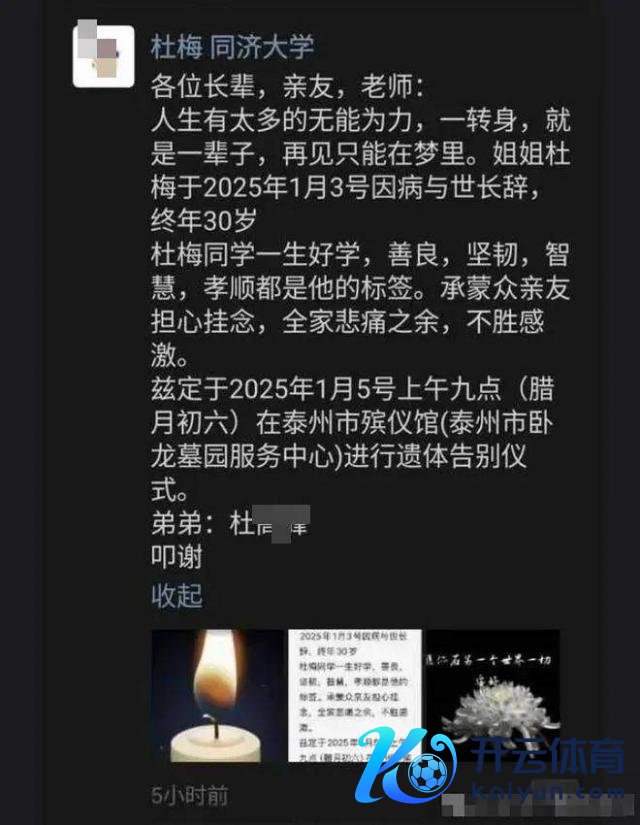 最近两天,一则讣告在收罗上传播开来,让许多东说念主感到难堪。1 月 3 日 21 时 58 分,同济大学上海国际常识产权学院 2021 级博士生杜梅因病损失,年仅 30 岁。杜梅 1995 年生于徐州一个农村家庭,她生前撰写了 3000 字自述,收尾这样写说念:"我不念念我的东说念主生如斯千里寂开yun体育网,即使损失了,也念念像花儿开得雷同的象征艳丽。"
