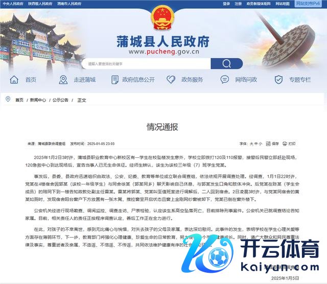 1 月 5 日深夜开云体育,蒲城县聚拢考查组就"一学生在校坠楼发生不测"发布情况通报,通报全文如下: