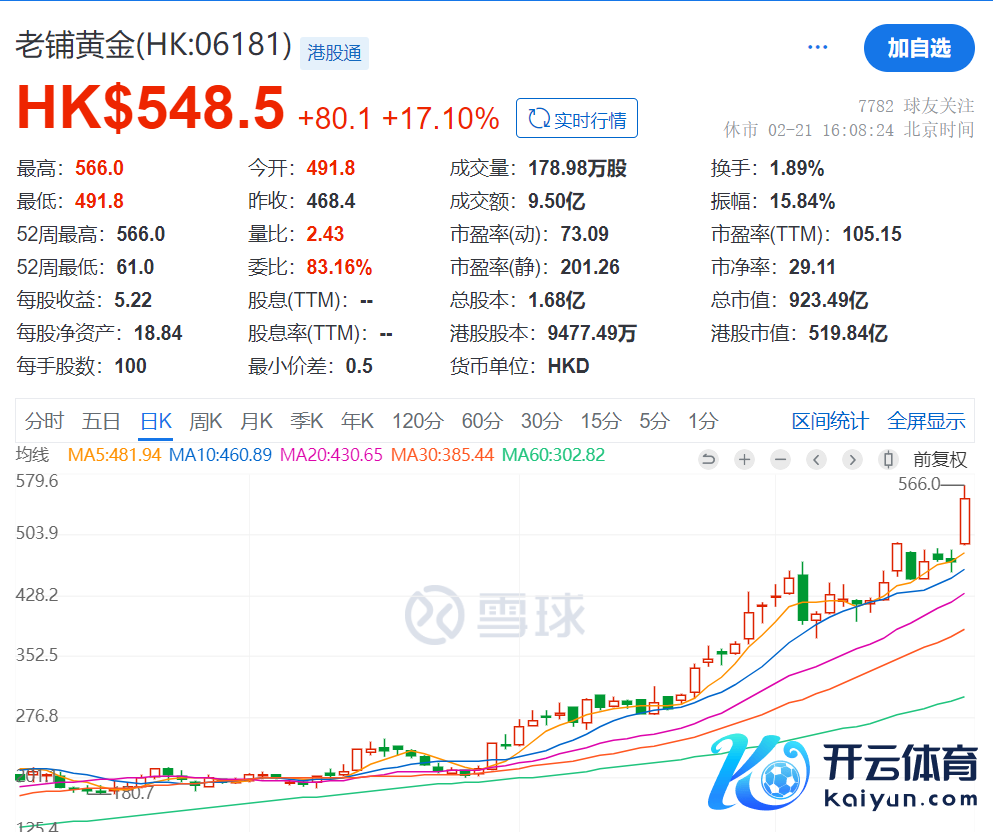 铺张者对老铺黄金的追捧更是反馈到了本钱市集。截止2月21日收盘,老铺黄金股价报548.5港元/股,当日盘中还创历史新高,最高每股价钱566港元/股,比拟之下,2024年6月底上市刊行价只消40.5港元/股,不到一年涨幅接近13倍。