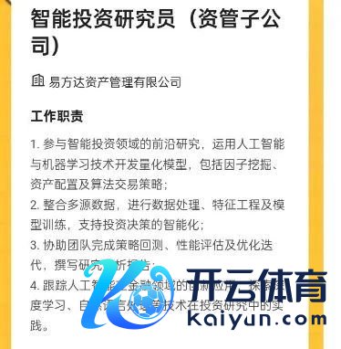 2月25日,易方达基金发布校招信息,其资管子公司正在招聘智能投资参议员。该职位主要职责本质包括:参与智能投资边界的前沿参议,期骗东说念主工智能与机器学习本事开辟量化模子,包括因子挖掘,财富设置及算法走动计谋;整合多源数据,进行数据处理、特征工程及模子考验,辅助投资有诡计的智能化;追踪东说念主工智能在金融边界的立异应用等。