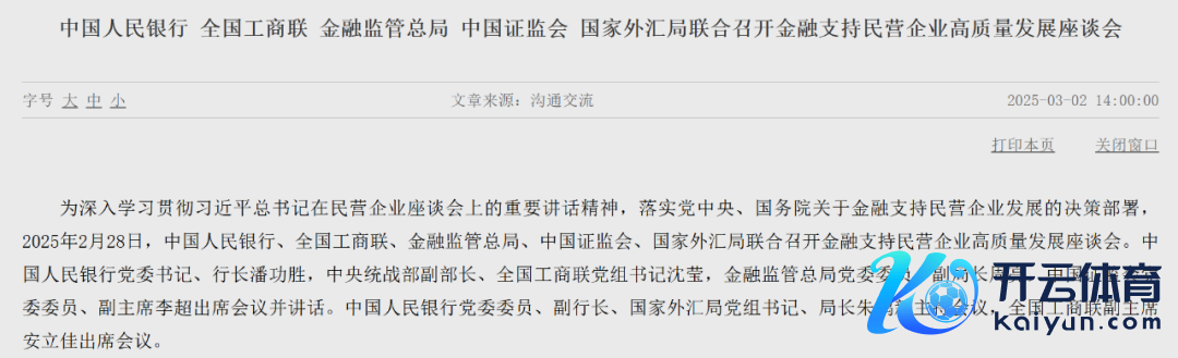 东说念主民银行网站3月2日音讯,2月28日,中国东说念主民银行、世界工商联、金融监管总局、中国证监会、国度外汇局连合召开金融缓助民营企业高质地发展谈话会。