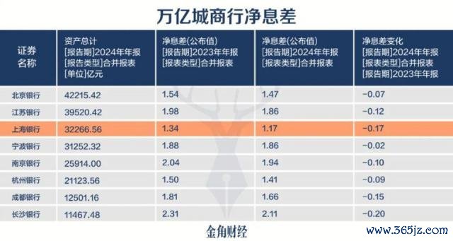 2023-2024 年,上海银行的净息差分别为 1.34% 和 1.17%,2024 年同比下落了 0.17%,这个降幅在万亿级城商行中名步骤二,仅低过长沙银行的 0.2%。