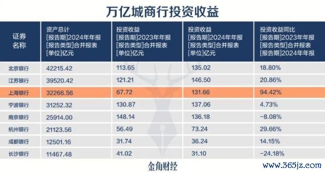 2024 年,上海银行的投资收益为 131.66 亿元,而更夸张的数据是同比增速,高达 94.42%,在万亿级的城商行中,这个增速卓越 20% 的就独一江苏银行的 20.86%,和杭州银行的 29.66%。