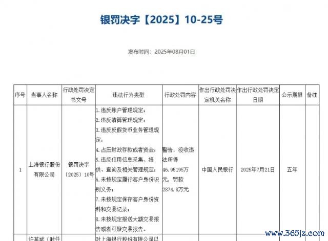 8 月 1 日,中国东谈主民银行挂出一则行政处罚公示,上海银行因账户措置、计帐、反伪物币等 8 项犯警违章活动被处以造就,充公犯警所得 46.95 万元,并罚金 2874.8 万元,统共罚没金额达 2921.75 万元。与这张多半罚单同步公布的,还有 15 名时任措置东谈主员的个东谈主处罚名单。