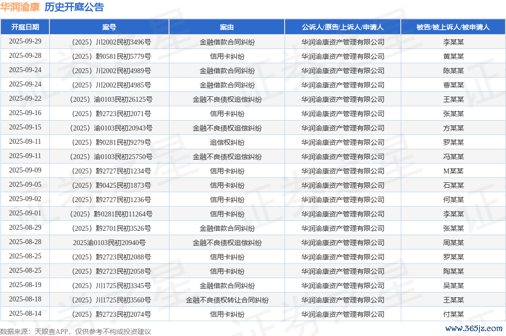 案号:(2025)黔2701民初3515号审理法院:齐匀市东说念主民法院案由:金融借钱公约纠纷当事东说念主信息: 原告/上诉东说念主:华润渝康金钱贬责有限公司 被告/被上诉东说念主:江某某开庭日历:2025年8月12日把柄统计,近一年内以华润渝康金钱贬责有限公司为当事东说念主的历史开庭公告有293则,其中案由为“金融不良债权追偿纠纷”的公告以164则居首,其次为“金融借钱公约纠纷”有77则,“信用卡纠纷”有14则。历史开庭公告(前20条)如下: